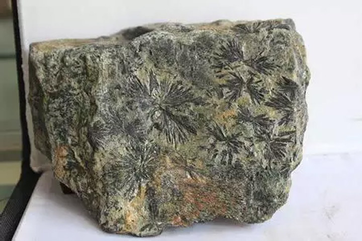 黑菊花石,又稱鋰藍閃石菊花石,出自新疆維吾爾自治區。該石是由鋰藍閃石呈放射狀分佈在絹雲母石英片岩的層面上構成,狀似朵朵開放的菊花,花朵大小不等,多為1~5公分。此石產在鋰輝石礦脈兩側的圍岩蝕變帶,寬約幾十公分至1公尺,有一定的資源量。