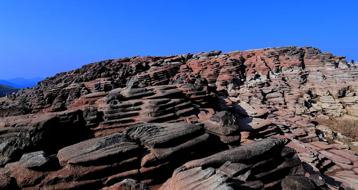 這片矗立在臘爾山之巔的紅石林山體,石與石相接,塊與塊相連,體積宏大,造型獨特,融紅、秀、峻、奇、絕、古於一身。紅石林形態各異,或層層疊疊,或嵯峨嶙峋,或形如樓閣,或狀如寶塔,陡峭險峻,氣勢雄偉,令人震撼。漫山遍野的矮簇生馬鞭草,映襯著巍然聳立的紅石林,場景壯觀,又不失明秀。