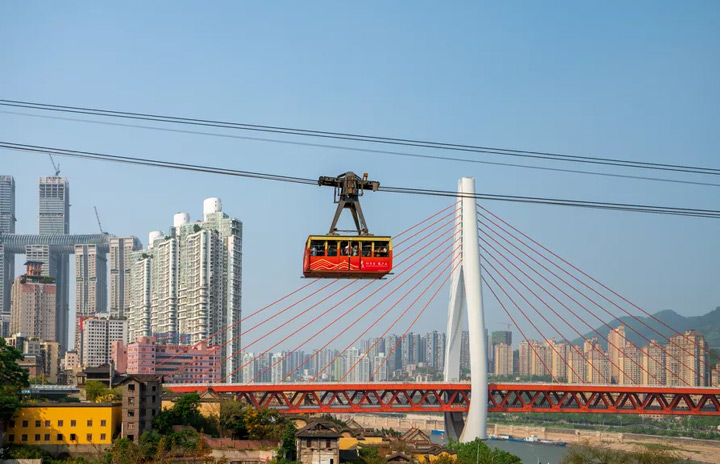 軌道交通2號線李子壩站→三層馬路老街區→鵝嶺貳廠文創園→龍湖重慶時代天街→山城巷→WFC會仙樓觀景台→環球購物中心→長江索道→朝天門來福士購物中心→朝天門廣場→兩江遊