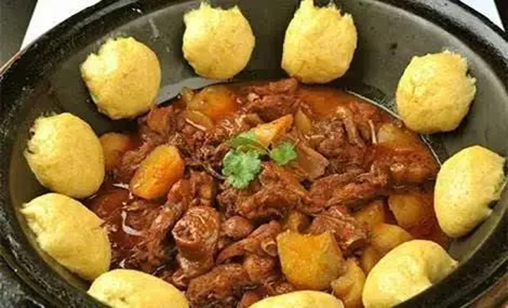 一個很奇怪的名字,原意是“主菜和主食一起上桌”。在鍋裡又燉菜又烀餅子。這道菜菜燉在鍋底,餅子貼在鍋邊。食材很豐富,味道也多種多樣。但是吃一鍋出帶來的幸福感卻是相同的——滿足。