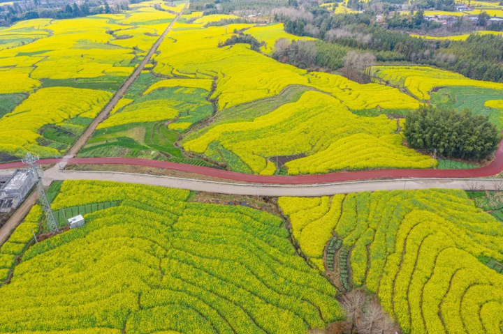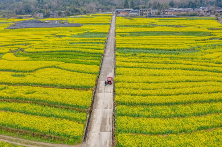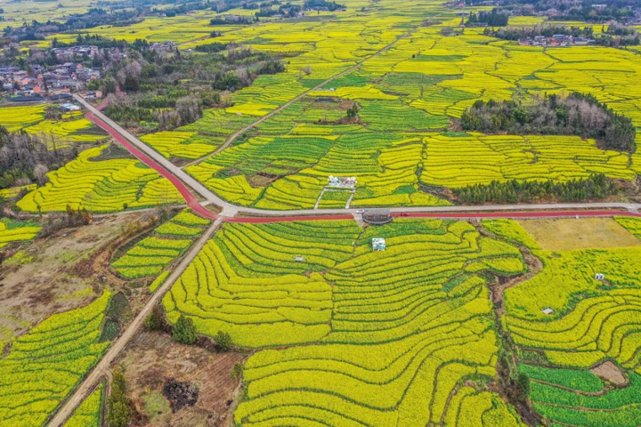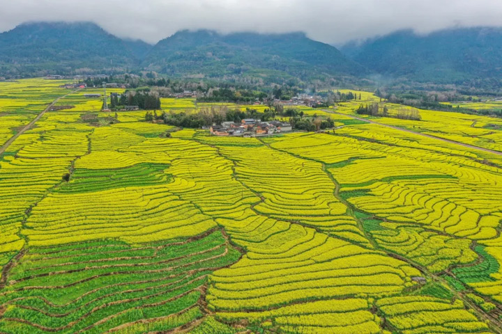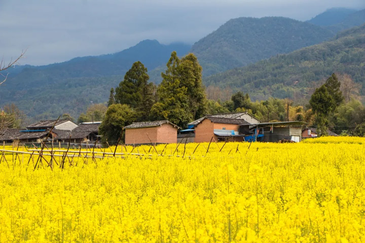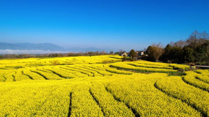 青青麥芒間,油菜花成片開放,一望無際。當你踏足這片土地,你會驚歎,人間竟有如此美麗的花海!