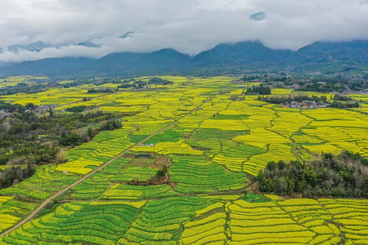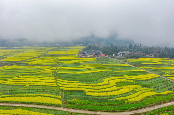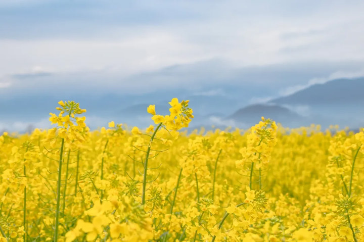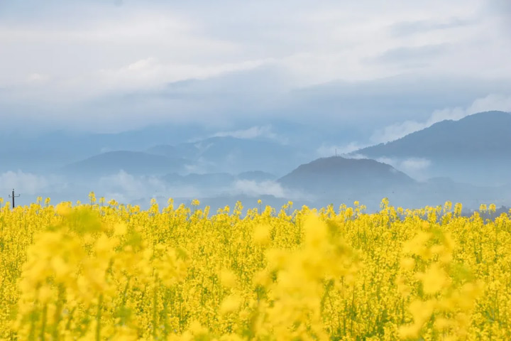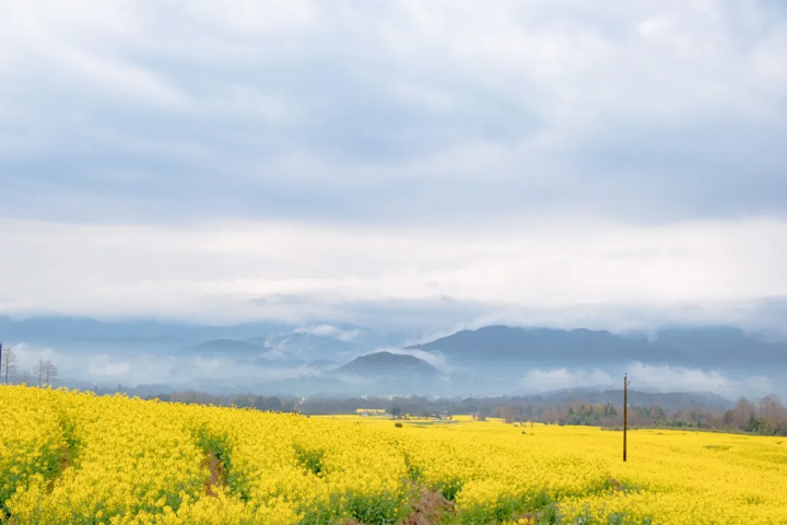 如果是晴空萬里,那花海便給你一個明媚的小清新之春;如果是陰雨綿綿,那花海便給你一個“雲海、遠山、菜花開”空靈之春。