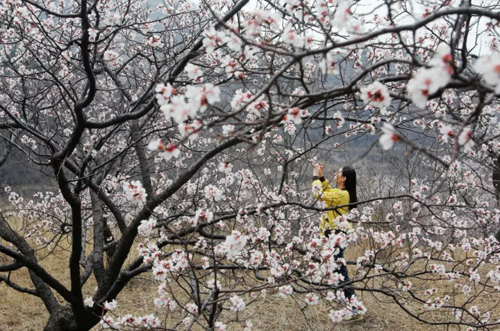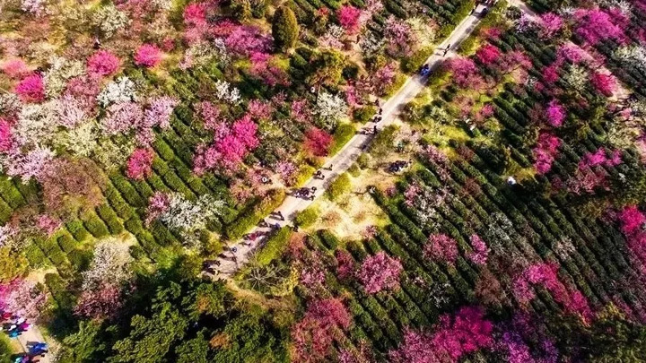 開元溶洞的上萬株梅花分佈在景區道路兩旁和梅花園中,一枝枝梅花在青山的映襯下,迎著春日暖陽開得更加絢爛,亭亭玉立,幽香四溢給人以驚豔之感。