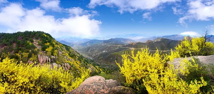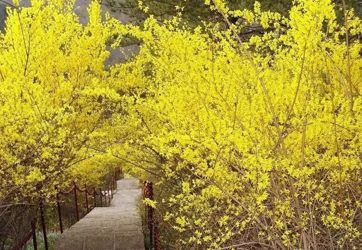 對於北方而言,只有連翹花開了,才意味著真正的春天來了,萬畝連翹迎春盛開,點綴在青山綠水間,就像黃金鋪地,鮮豔奪目。