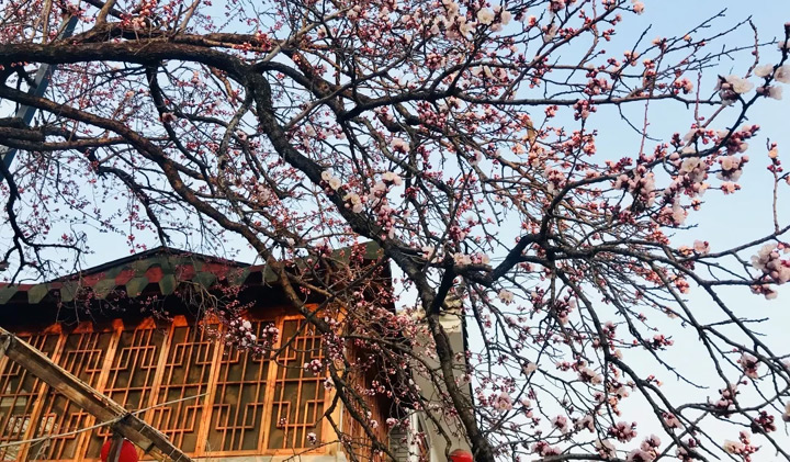 杏花,春雨,粉白色的花朵開滿枝頭,像一隻只粉蝶兒震翅欲飛,幾枝待開的花蕾亦如嬌羞的女孩般,露出絨絨的粉色。