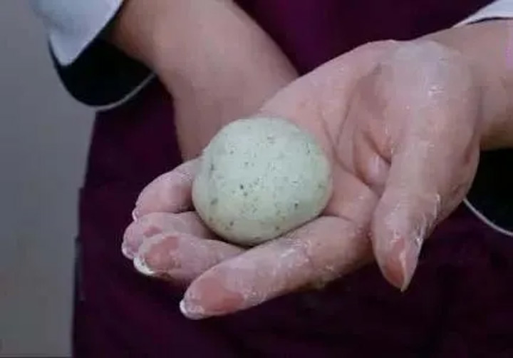 5.從揉好的麵團中取一小劑子,用手輕輕把它窩成小窩窩頭的樣子,然後根據各自口味放入餡料。封口,然後搓圓,一個艾葉糍粑就算包好了。