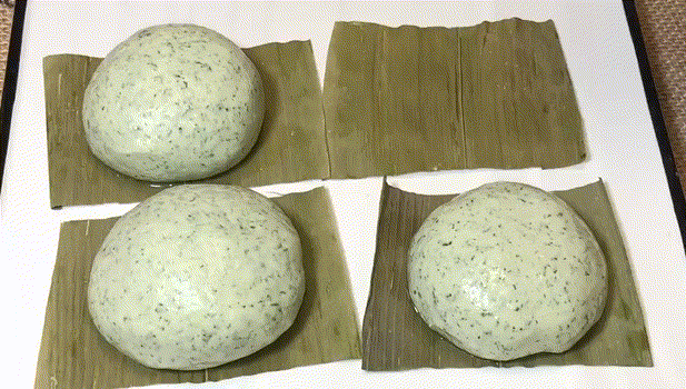 6.做好的艾葉糍粑,放到粽子葉上,艾葉粑粑上抹油,待鍋內水燒開,水開後大火蒸10分鐘左右即可。