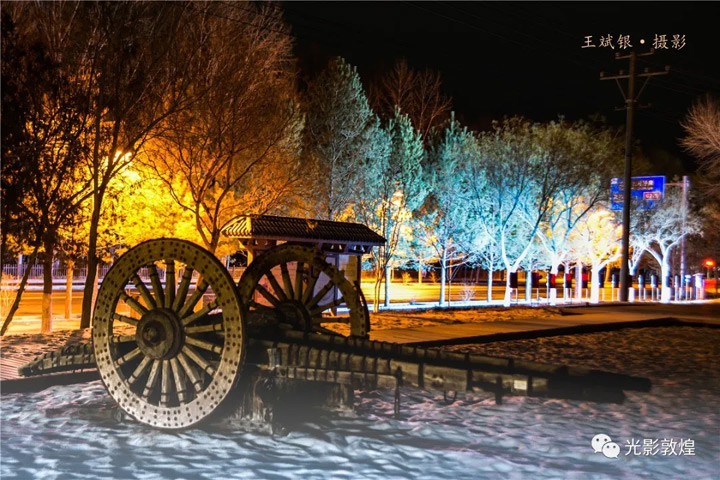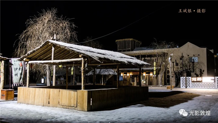 大漠敦煌天氣陰灰、氣溫下降,天上飄起了雪花,不到半小時,地面上就鋪上了一層薄薄的雪花。
