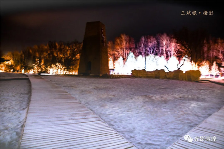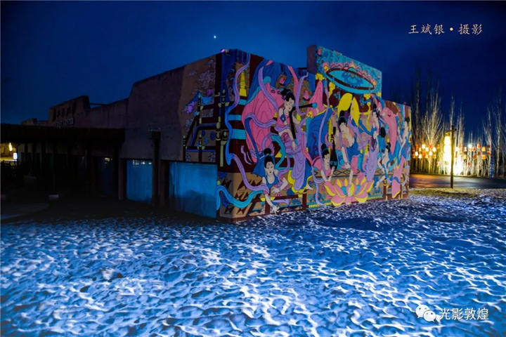 敦煌飛天壁畫在雪地裡顯得鮮豔奪目。