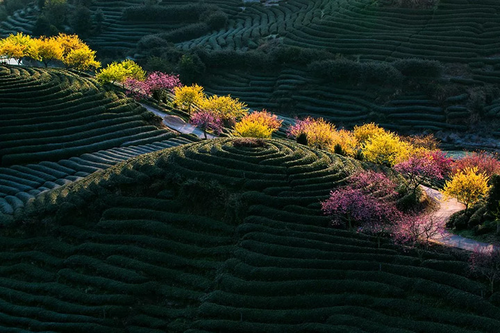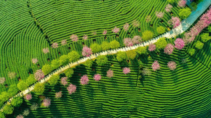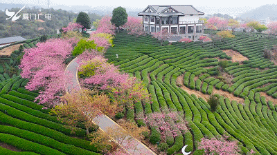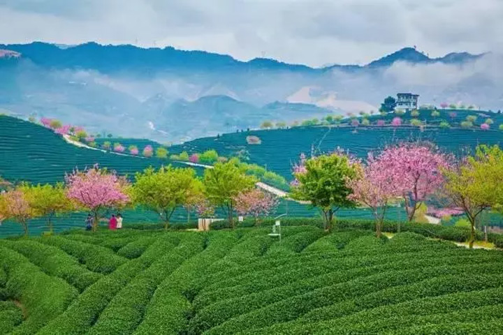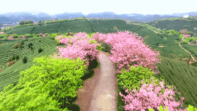 千畝茶園搭配萬株櫻花浪漫而神秘, 鬱鬱蔥蔥的茶田和粉紅可人的櫻花相互輝映,猶如世外桃源……