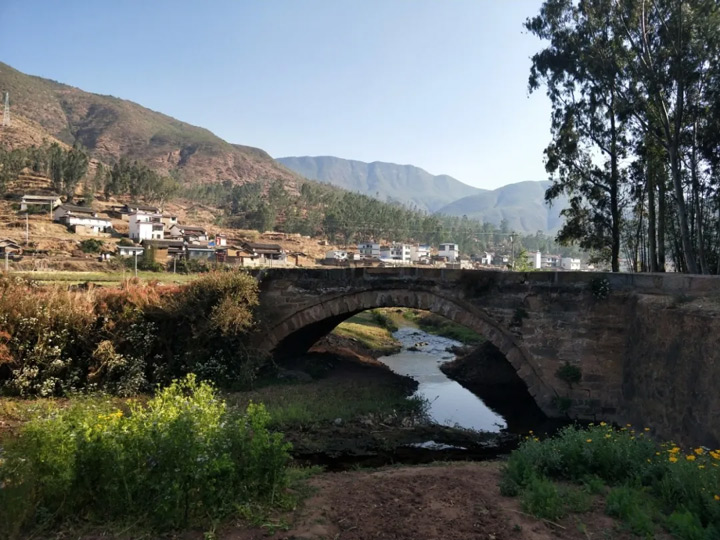 西元1638年十二月初六,徐霞客帶著雇來的僕人從元馬鎮東郊的官茶房向爐頭壩今新華朝大姚走去。初七日,到達過龍街河南岸的下河底村、上河底村,親身感受到大姚“夷村”(彝族村)誠摯待客的淳樸民風。然後來到倉屯壩子北邊山腳下的獨木橋村,今天的永勝橋村,村中有一個座北朝南的法慧寺,幾位從北方京城來的僧人把徐霞客一行迎接到了法慧寺中吃飯住宿。(之後,寺廟作糧點所,現還有舊址存在。)。據《徐霞客遊記》:初七日…又行南峽一里餘,則有石樑一鞏,東西跨溪上,是為獨木橋。…橋側有梅一株,枝叢而幹甚古,瓣細而花甚密,綠蒂朱蕾,冰魂粉眼,恍見吾鄉故人,不若滇省所見,皆帶葉紅花,盡失其“雪滿山中,月明林下”之意也。乃折梅一枝,少憩橋端。…路溯溪北崖,循北山西行,一里,有聚落倚北山下,是為獨木橋村。