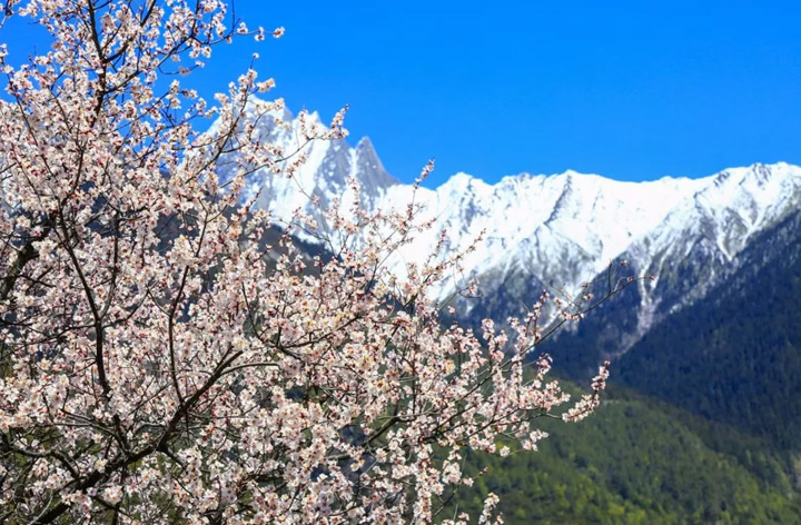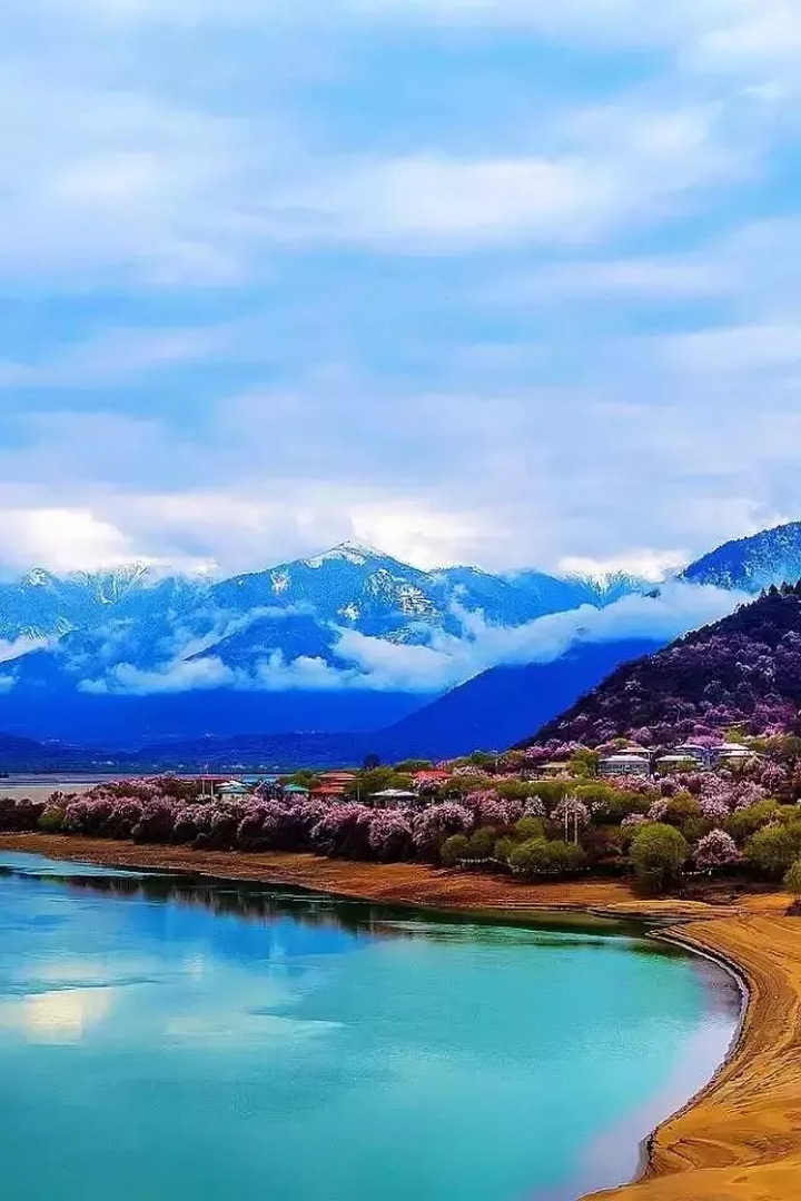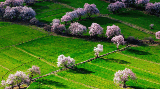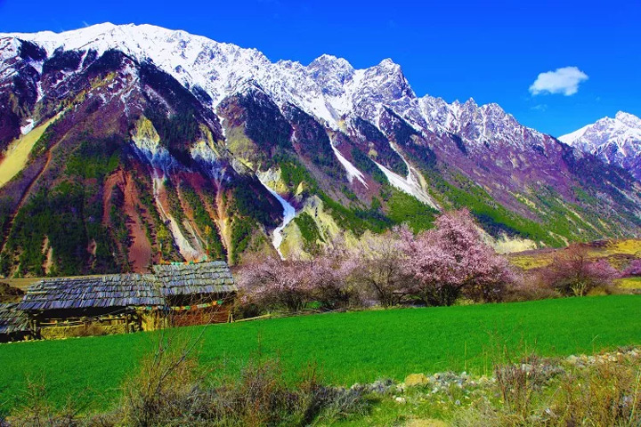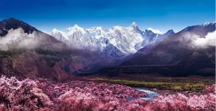 遠方連綿的潔白雪峰,成片的粉紅桃花,碧綠的青稞田,美麗的藏民居和灣灣的河流構成一副仙境般的畫卷。
