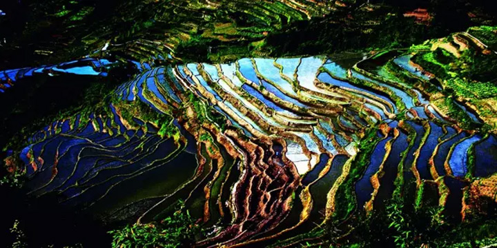 盛滿水的梯田呈現出五彩繽紛的色彩