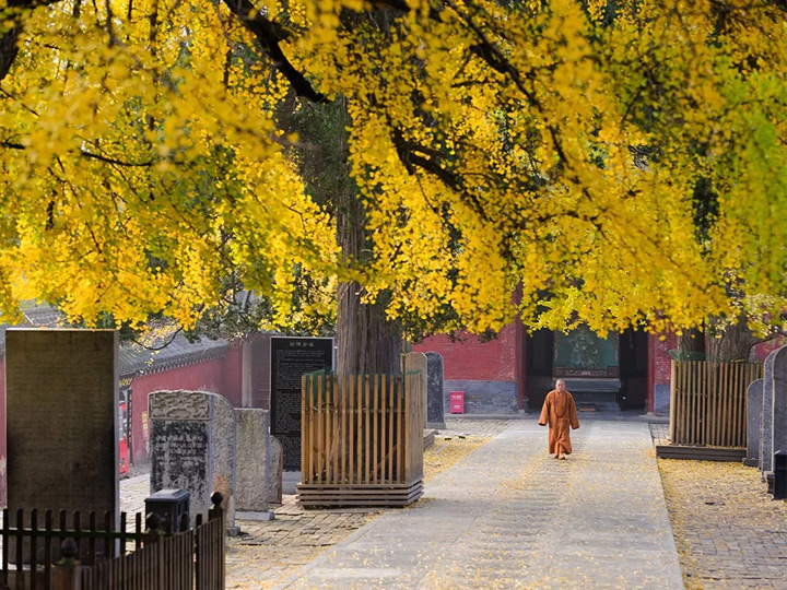 事實證明,“不起眼”的蓮花甬道著實為少林寺增添許多禪韻。穿過山門,漫步於蓮花甬道,蒼松翠柏掩映下的碑林訴說著少林寺悠久的歷史。步步生蓮,腳下的石板路便是此番朝聖的起點。走完七步,心生肅穆,縱使遊人嘈雜,也隱隱有種“結廬在人境,而無車馬喧。”的安寧。倘若恰逢時節,蒼勁挺拔、枝繁葉茂的古銀杏樹再給甬道鋪上一層金色地毯,震撼之余,此方天地仿佛已定格千年。
