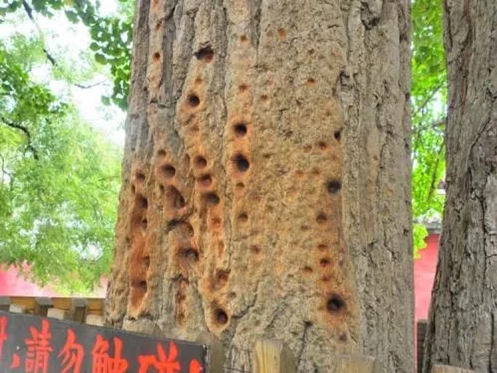 “羅漢樹”還是一棵“陪練樹”,上前觀察這棵樹你會發現,樹幹上有許多大小不一孔洞。相傳是當年少林寺的武僧苦練金剛指留下的。