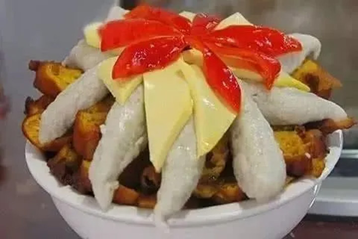土頭碗是湖南衡陽人的酒席必備菜譜。衡陽人結婚、生子、祝壽或者逢年過年都少不了它,而且一定是酒席上的第一道菜。玉麟香腰造型美觀,色彩豔麗,鹹甜鮮香,味美可口。相傳清朝官至兩江總督、兵部尚書、太子太保的衡陽名將彭玉麟在一次宴客之時請大家吃了一道衡陽美味,客人不知菜名,紛紛詢問,家廚答道“堆子菜”,客人覺得不雅,於是建議,此菜為彭公所創,便取名“玉麟香腰”。