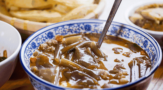 渣江假羊肉,之所以叫假羊肉,是因為它並非羊肉做成,而是由豬頭肉、豬瘦肉、荷折皮烹製而成,一碗正宗的假羊肉,必然是熱辣滾燙,荷折皮滾燙又非常爽滑,豬頭肉非常勁道,湯汁濃郁熱辣,鮮香四溢,醇厚可口,吃後渾身發熱,不僅能充饑解饞,更能抵禦寒冷預防疾病。名不虛傳!