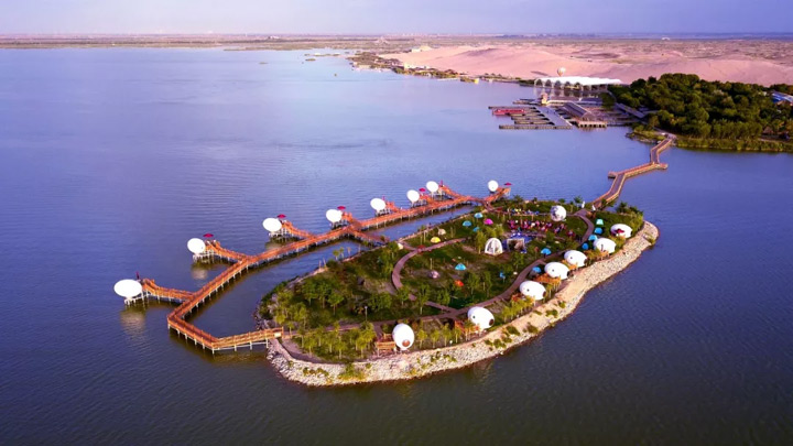 寧夏境內的沙漠有黃河環繞、高山依偎、綠洲映襯,既有江南景色之秀美,又兼西北風光之雄奇,治沙成果令世界矚目。沙坡頭景區堪稱世界沙都,大漠、黃河、高山、綠洲在這裡相遇,是“中國大陸十大最好玩的地方”。