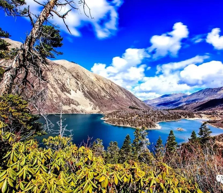 藍天、白雲、雪山夾著一片片澄澈湛藍的湖水,和煦的陽光灑下,一片歲月靜好。 那湖水像是一條條剛從染缸裡扯出的藍色綢帶;又像是一面面光可鑒人的巨大寶鏡,展現著變幻莫測的風光。