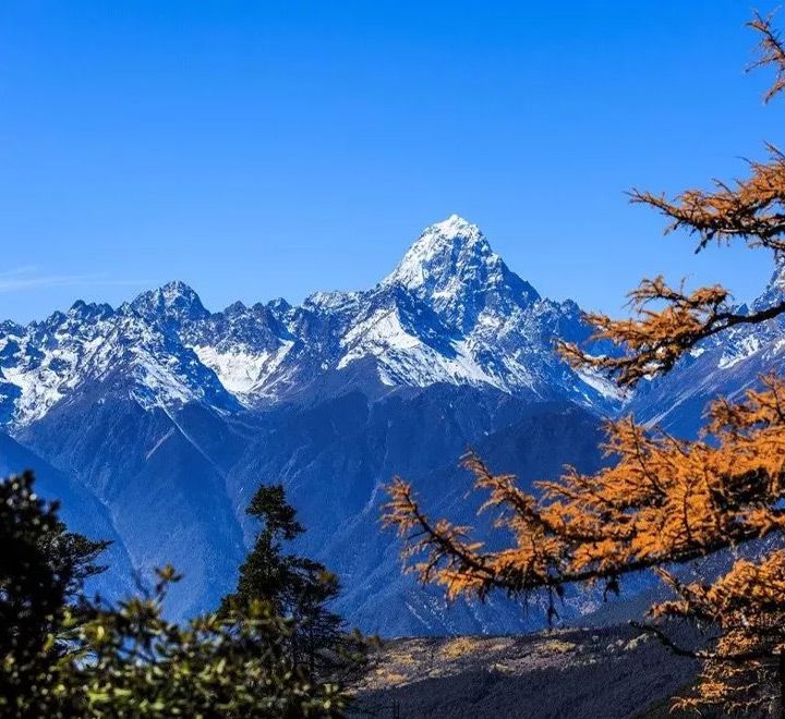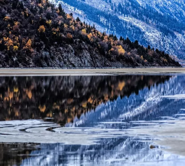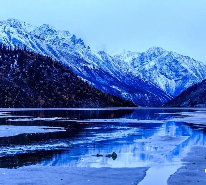 巍峨壯麗的雪山直插雲霄,山下的湖泊倒映著雄壯的雪山,神聖之感油然而生。