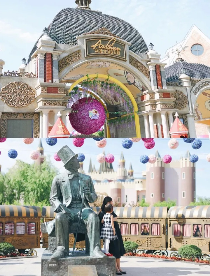 門口的安徒生真人銅像,完全模仿位於丹麥哥本哈根市政廳廣場的安徒生真人銅像,是世界範圍內唯一授權的安徒生真人銅像複製品。園內還有一條長長的紫藤長廊,特別美特別柔和,愛拍照的小夥伴千萬別錯過了。