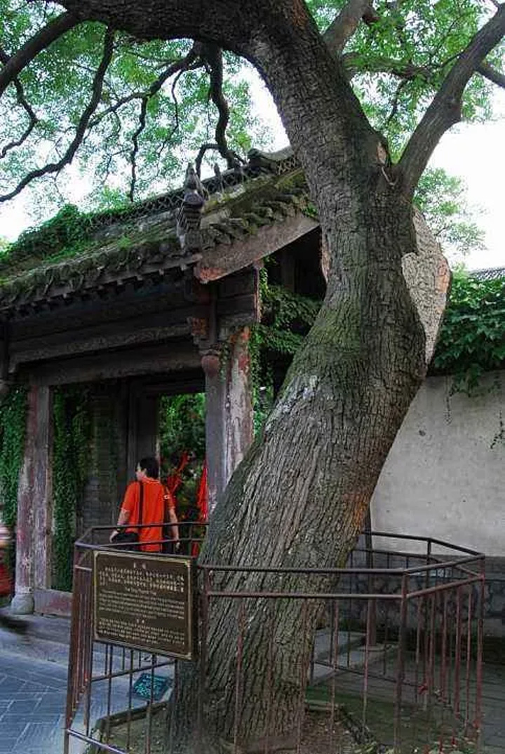 如果仔細觀察,還可以發現樹幹中間這塊樹皮的紋理和顏色,和其他地方有些差別。關於這塊樹皮,還有這樣一個傳說,當年張果老帶著他的毛驢在唐槐樹下休息,不料毛驢在張果老睡著的時候,把中間這塊樹皮啃了下來,於是張果老醒來以後,就把驢身上皮的貼到了樹上。當然這只是一個小故事。事實上,由於年代久遠,這棵唐槐的樹心已經腐朽,形成了一個大洞,園林專家們給它填上了水泥和土磚,起到支撐作用的同時,還可以吸潮,以免樹幹被繼續腐蝕。