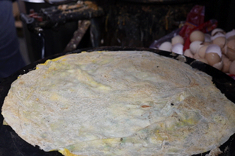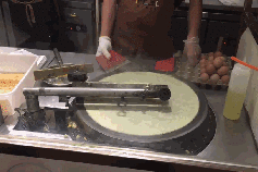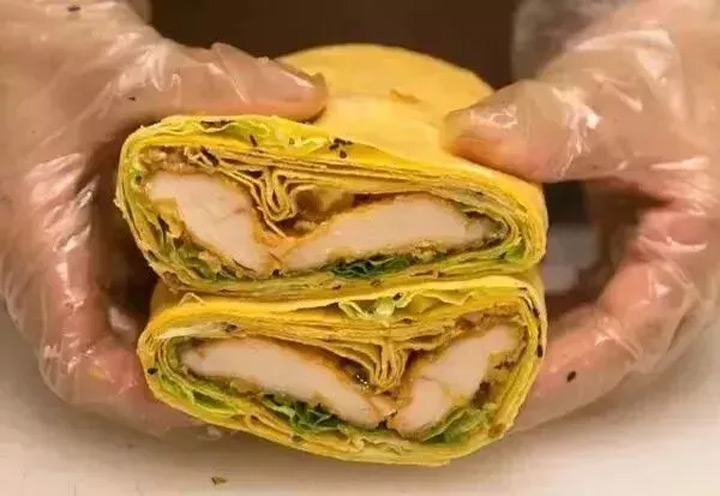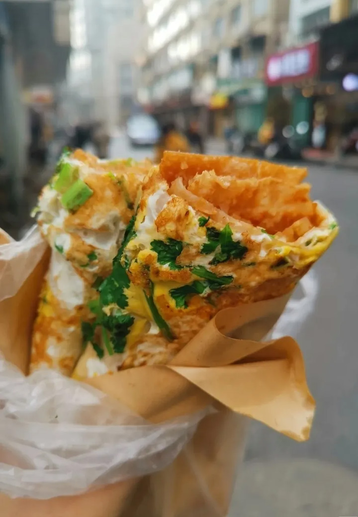 一輛爐子起得旺旺的小推車,一位手拿刮板的攤主,在車來人往的喧囂中插進一股饞人的香味。撩一勺麵漿,刮一面薄餅,磕一個鶏蛋,刷一層醬料,鋪一塊薄脆,撒一把小葱和榨菜,嘿!一個熱乎乎的 包脚布 就成啦!