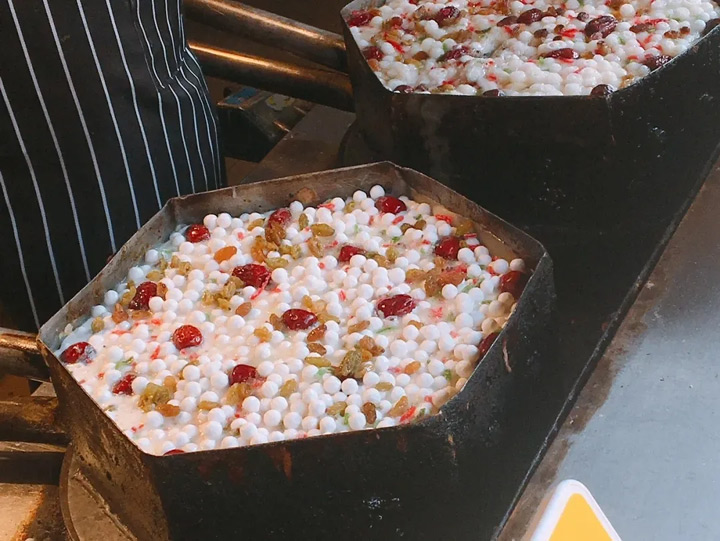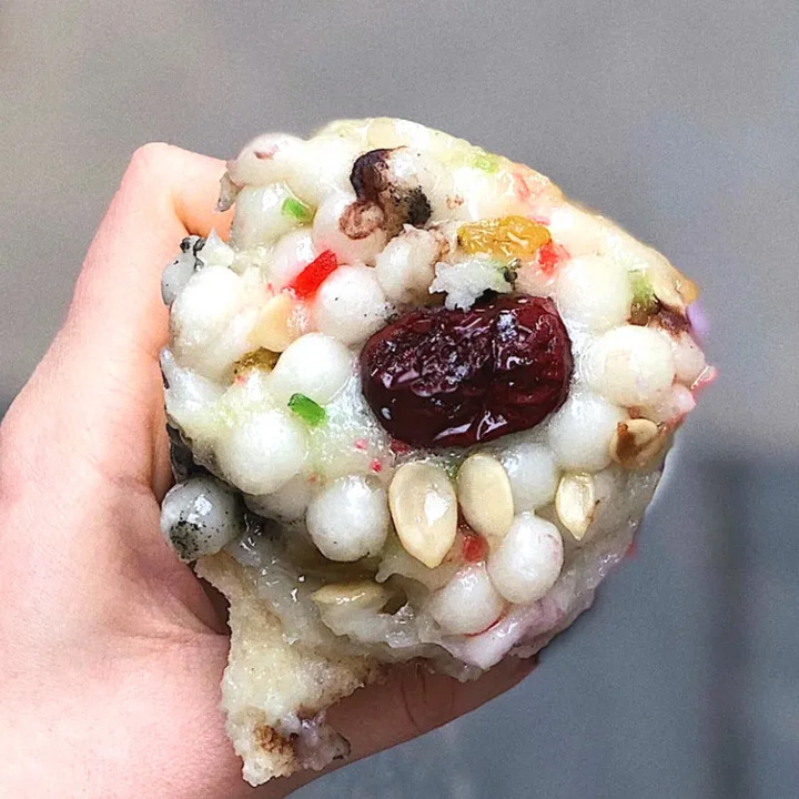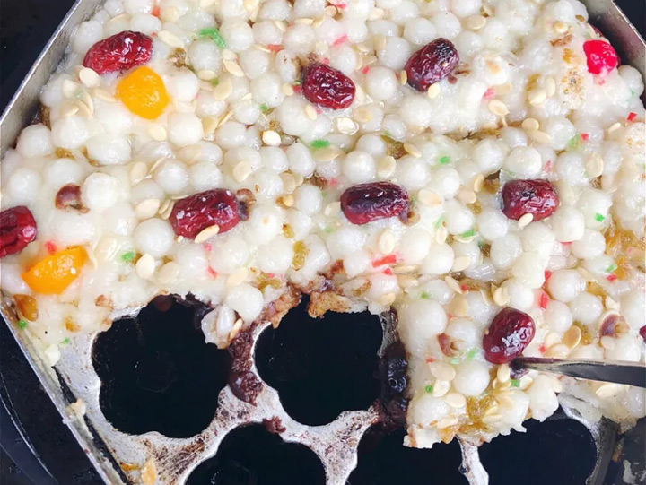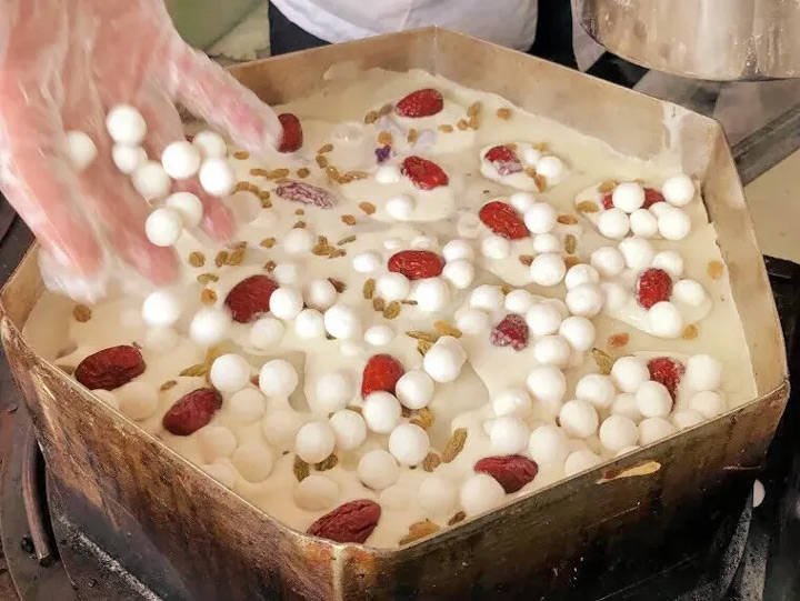 綿軟的糕體中藏著由玫瑰花瓣、鹹桂花、赤豆混合成的餡料,表面撒上紅棗、葡萄乾、酒釀圓子等。料多且不貴,人民幣6元就搞定。愛甜食的你必須買一個嘗嘗!