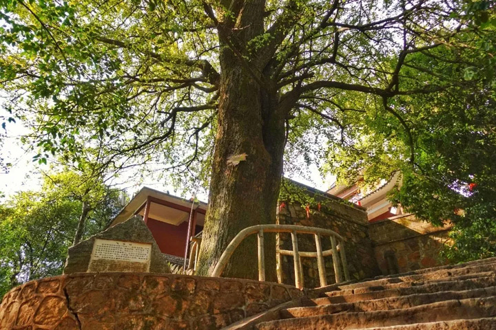走出紅葉谷,山道臺階彎彎曲曲,看不盡群巒叠翠,古木參天,濃蔭匝地。一個不知名的亭子悠然在望,剛想坐下歇息,却被亭上對聯所吸引:“何處臨江高閣近,幾人芳草夕陽來”,愛惜玩味之下,竟然疲憊盡消。
