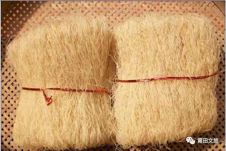 興化米粉白如雪,細如絲,是中國大陸最早的速食之一,名揚海內外,尤為海外僑胞所喜愛。米粉需要經過九步製作工序,先選用上等大米原料,浸磨成漿,碾壓成團塊,入蒸籠蒸半熟後,經細孔壓出細絲,不絕如縷。再折疊成一層層米粉片,晾乾後用一根稻草束腰。