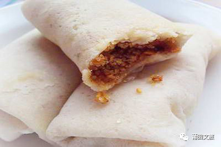 赤餅是仙遊縣獨特的糕點之一,它是將麵粉和成團,再用平鍋燙成麵皮,然後裹上炒熟的花生粉、芝麻、白糖,再加入半截油條,包成春捲形狀即成。皮韌餡甜,香味滿口。