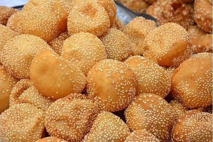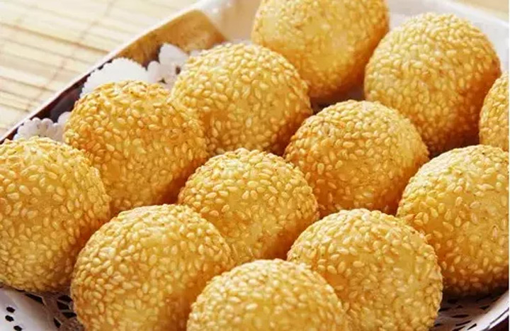 煎堆又叫煎圓,是用糯米粉加糖、油炸花生碎、芝麻等,放到鍋裡用油煎成。色澤金黃,外形渾圓中空,口感芳香酥脆體積膨大滾圓,表皮薄脆清香,而又柔軟粘連,餡又香甜可口。有團圓甜蜜的寓意。