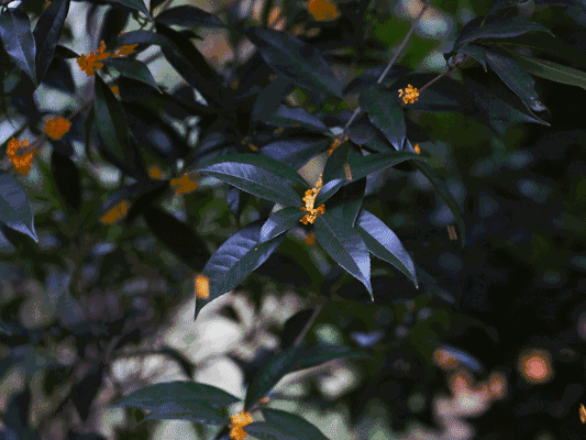 走近了,你才能見到那細如小米粒的桂花就躲在綠葉下邊,往往是十幾朵、幾十朵相互簇擁著靜靜地綻放。