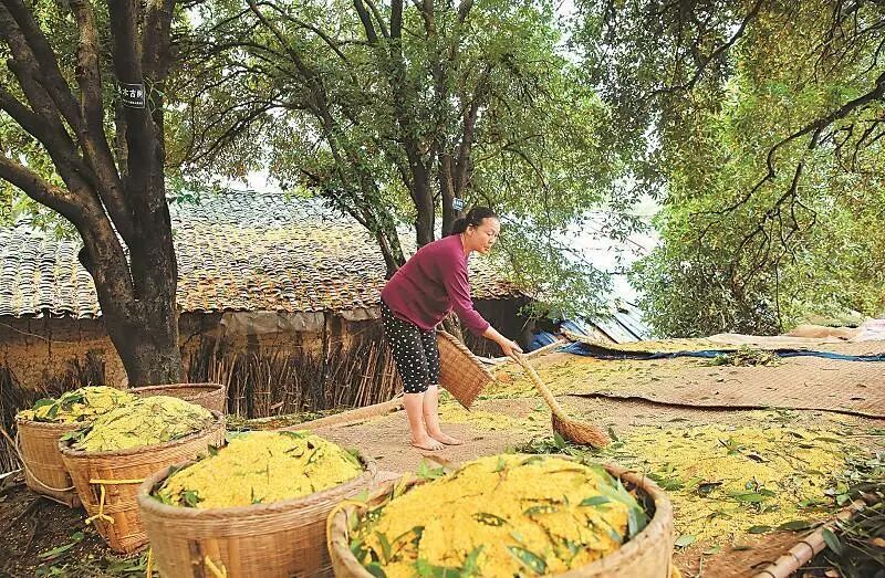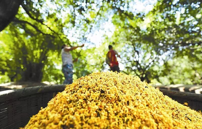 要是遇上采桂勞動,只見群群採花女,拉著布墊,或搖曳枝頭,或持竿擊花,頓時,花雨紛紛,則是一幅「桂子月中落,天香雲外飄」的美麗畫面。