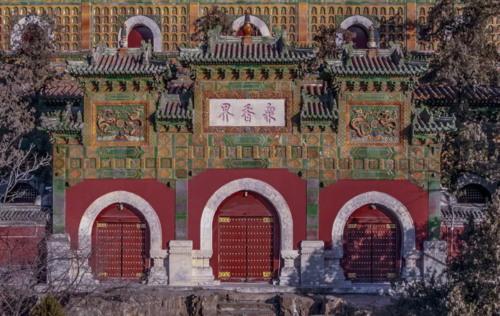 這座高約13公尺、面闊約25公尺的彩色琉璃牌坊高大而精美,南額爲“華藏界”,北額爲“須彌春”,意爲人們將要從這裡進入佛國的莊嚴世界。