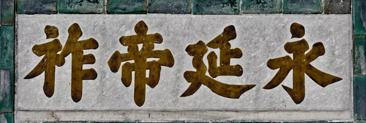 牌坊南面的額題爲“秩祀岱宗”,北面爲“永延帝祚”,意爲皇圖永固,國運綿延,據傳均爲明代宰相嚴嵩所書。南面石匾,上款爲“萬曆丁未孟秋吉日”,下屬“內官監總理太監馬謙、陳永壽、盧升立”。由此可知,這座琉璃牌坊是皇宮裡的太監們捐資所建。