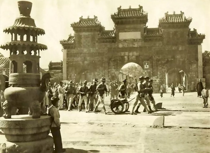 1915年前後,東岳廟琉璃牌坊北側行進的美軍和廟山門前的香爐