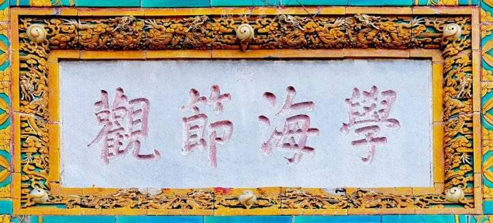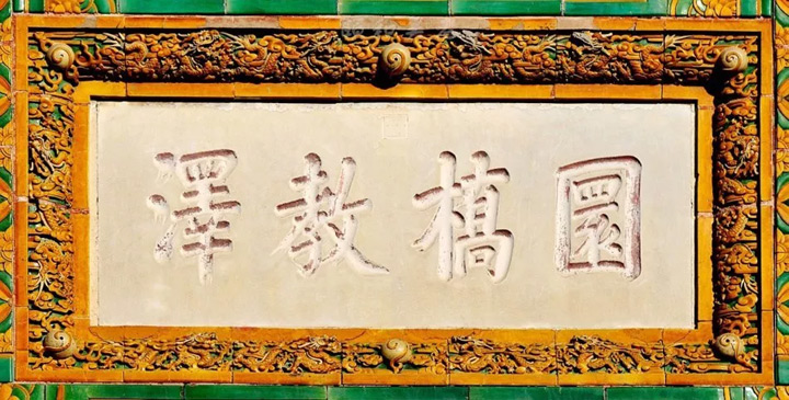 牌坊中門上方,南北兩面分別爲“圜橋教澤”和“學海節觀”橫額,是乾隆皇帝御筆親書。“圜橋教澤”意指辟雍四面環水,水周流不斷,象徵教化不息;“學海節觀”則是指聽講者衆多,皇帝臨雍視學時不得不把學生分開聽講,兩者含義都與教育有著直接關係。