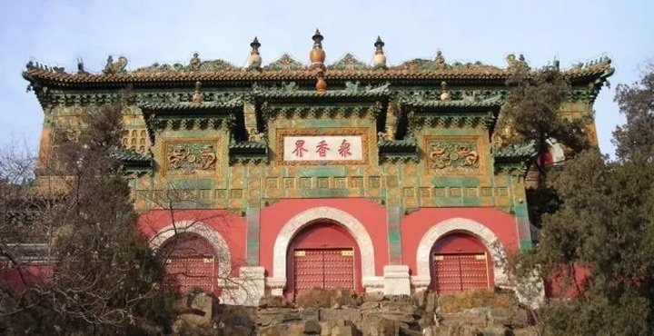 在頤和園排雲殿上方,高聳的佛香閣與智慧兩座佛殿之間竪立著一座琉璃牌坊,門洞中安有門扇,這裡就是智慧海佛院的院門。