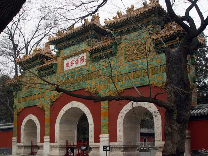 臥佛寺的牌坊建于乾隆年間,是一座彩色琉璃牌坊。牌坊匾額爲乾隆御筆親題“同參密藏”,意爲共同參拜學習密宗佛典。背面爲“具足精嚴”,意爲此地能獲得佛家教義精華。