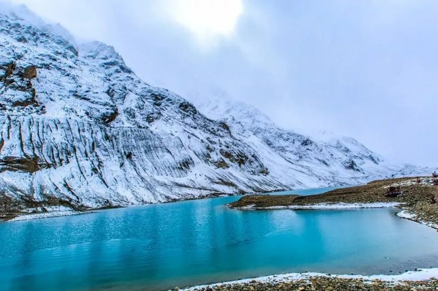 俯瞰三色湖成不規則“品”字排列,湖與湖之間由低山隔開,均是多年冰雪融水而形成的。