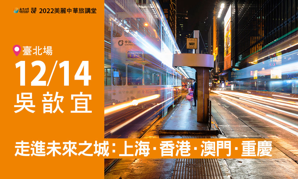 12/07 【美麗中華旅講堂‧臺北場】兩岸登山鐵路與高速鐵路 12/11 【美麗中華旅講堂‧臺中場】認識「閩南海外移民的守護神-祖師公」 12/14 【美麗中華旅講堂‧臺北場】走進未來之城:上海•香港•澳門•重慶 12/17 【美麗中華旅講堂‧臺南場】綺羅粉黛:明清服飾時尚與崑曲戲服 12/18 【美麗中華旅講堂‧高雄場】從天堂到人間:跟著華語電影地景去旅行