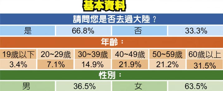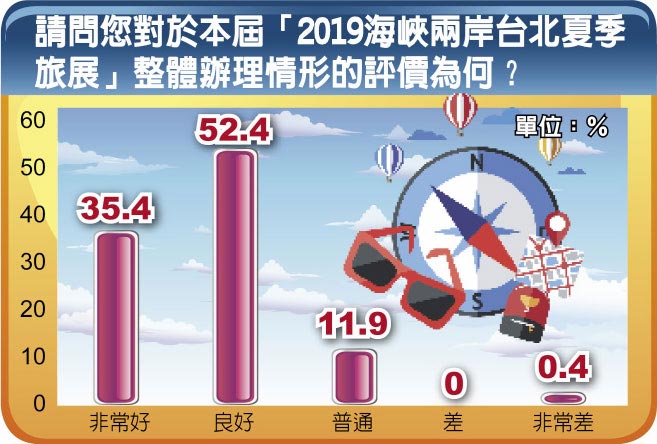 2019海峽兩岸台北夏季旅展,由「海峽兩岸旅遊交流協會」及「旅行業品質保障協會」於7月19、20日,針對800位觀展民眾進行「赴陸旅遊意見調查」。發現近8成民眾對前往大陸旅遊抱持高度興趣,今年民眾年齡趨向年輕化,且33.3%未曾去過大陸,高過去年的24.4%。超過56%認為,旅遊理想天數約6~8天、近1成希望12天以上的深度旅遊。