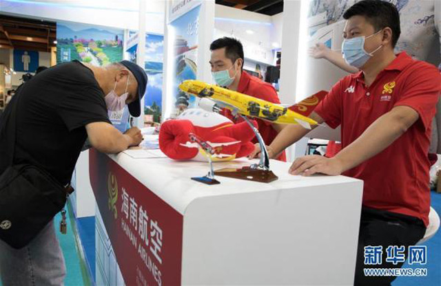 8月28日,參觀者在海南航空展臺前瞭解信息。 當日,爲期4天的2020臺北觀光博覽會開幕。兩岸旅遊業者努力通過精彩的旅行方案和詳細的文宣資料,給臺灣遊客“種草”中國大陸的人文自然風光。 新華社記者 金立旺 攝