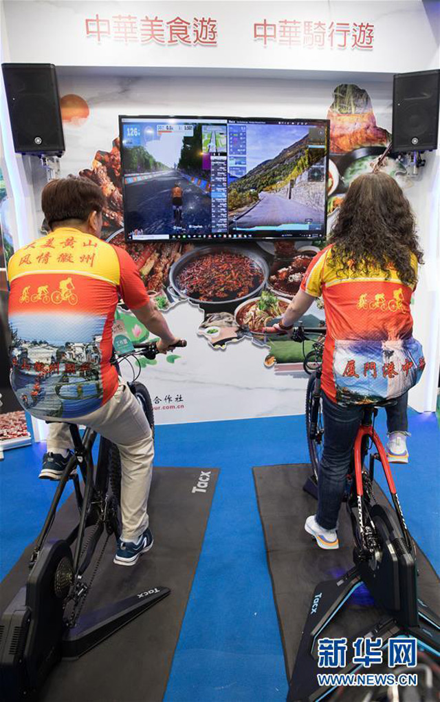 8月28日,工作人員向參觀者展示虛擬體驗中國大陸自行車騎行旅遊綫路和美食旅行綫路。 當日,爲期4天的2020臺北觀光博覽會開幕。兩岸旅遊業者努力通過精彩的旅行方案和詳細的文宣資料,給臺灣遊客“種草” 中國大陸的人文自然風光。 新華社記者 金立旺 攝