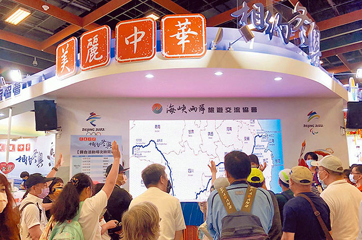 2021台北夏季暨秋季聯合旅展4日落幕,大陸海旅會以「美麗中華」為主題設置兩岸展區,介紹大陸觀光資訊及明年北京冬奧行程,吸引民眾駐足圍觀。(許依晨攝)
