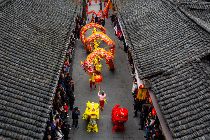 舞龍舞獅是民間傳統習俗,來自四川省的龍獅隊在閬中古城古街道進行鬧春表演。