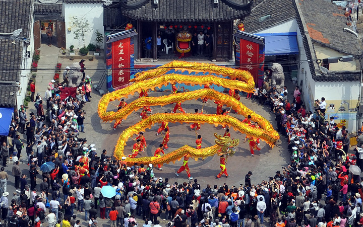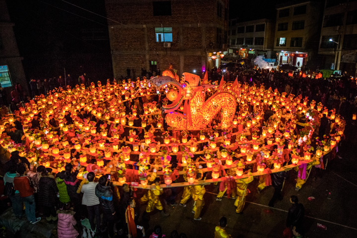 安徽省池州市青陽縣,正月十五元宵節,舉行盛大的舞龍表演。