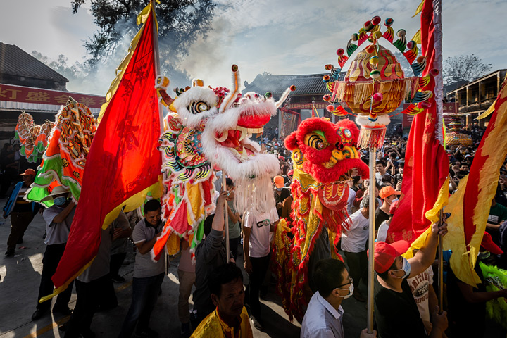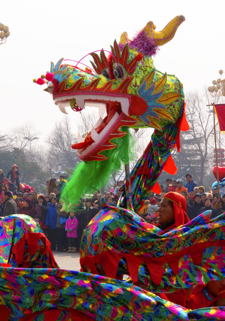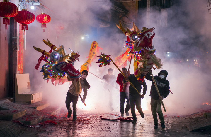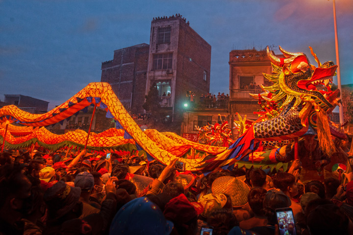 春節期間,人民涌上街頭,共同感受舞龍的熱鬧氣氛。