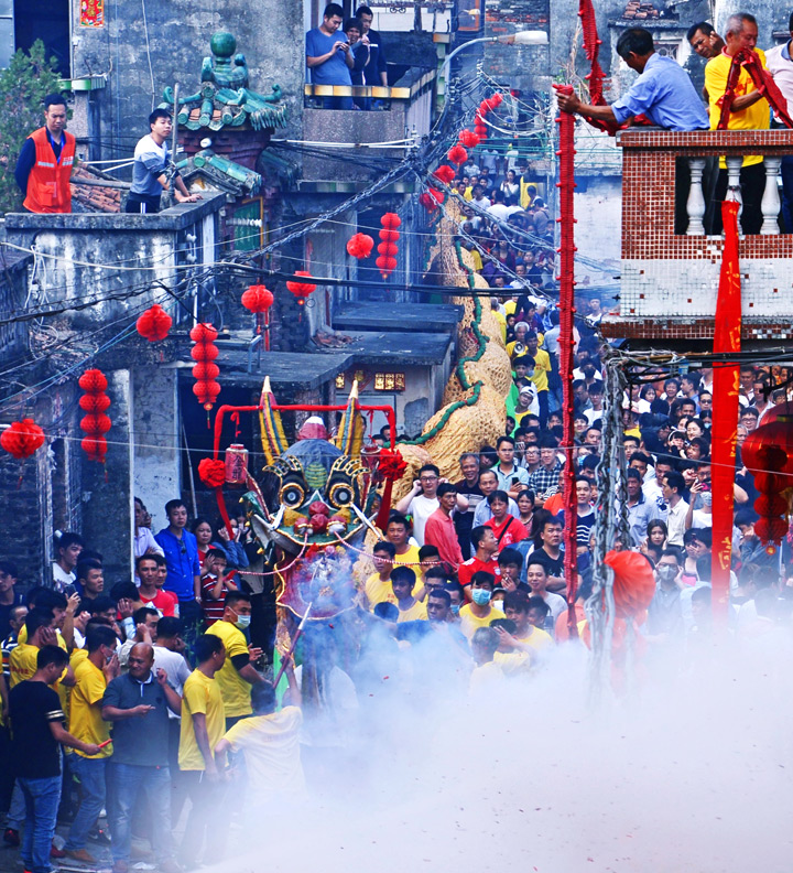 廣東省江門市舉行的舞龍活動,遊龍所到之處,鑼鼓喧天、鞭炮齊鳴,富有濃濃的年味。
